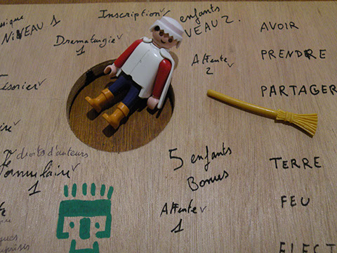 Dans tous les cas, l'empreinte humaine marque un prélèvement des ressources qui est donné par les acteurs qui retire des parties de l'aire de jeu où se trouvent tous les playmobils : trois rochers et trois bois en moins pour créer une maison. Je me suis demandé à partir de quand il n'y aurait plus de ressources et que les spectateurs ne pourrait plus créer de nouvelles installations.
